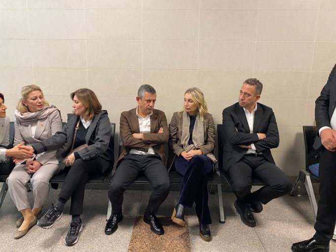 Photo on social media: Ozel (middle) on October 26 waiting in a corridor of Caglayan courthouse in Istanbul together with Dilek Imamoglu (second right) and Ali Mahir Basarir (furthest right, he is Ozel’s deputy chairman in the CHP’s parliamentary group). The waiting took place as Ekrem Imamoglu was questioned in the espionage case that has brought the latest allegations thrown at him.