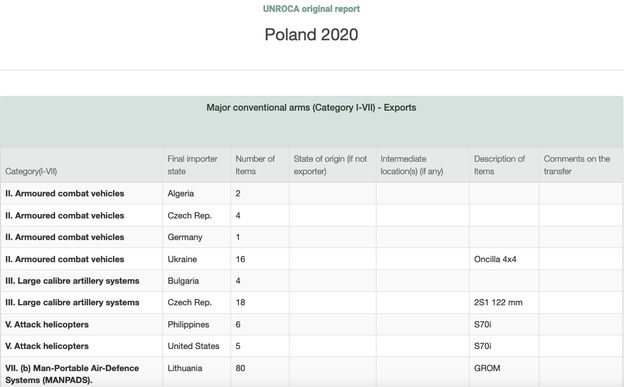 Poland’s main arms exports in 2020 were armoured combat vehicles, large-calibre artillery systems, attack helicopters and man-portable air-defence system, known as MANPADS. That said, Poland exported a total of just 23 armoured combat vehicles, 22 artillery systems, 11 helicopters and 80 MANPADS.