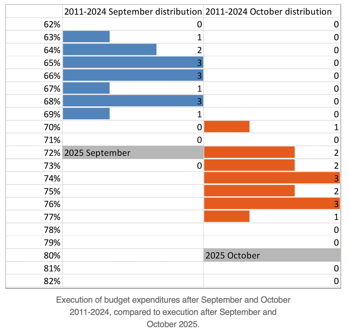 From 2011 to 2024, the average execution rates for those months were 66% in September and 74% in October. But in 2025, Russia had already surpassed those benchmarks by several percentage points.