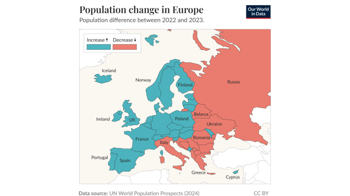 The map shows which European countries saw an increase in population, and which saw a decrease in the year from July 2022 to 2023, Our World in Data (OWID) reports