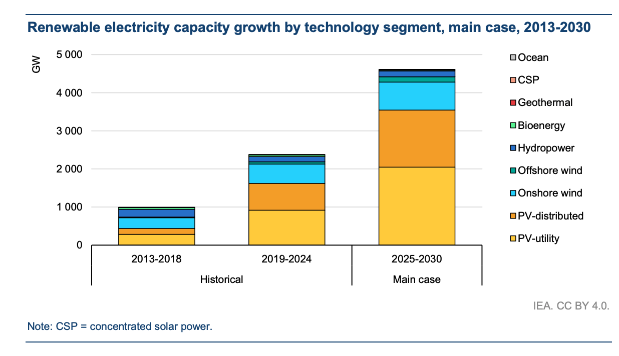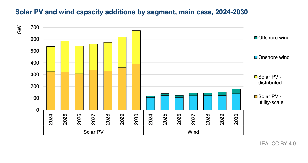 Wind energy is also projected to nearly double by the end of the decade, surpassing 2,000 GW, although growth is constrained by persistent supply chain challenges and inflationary pressure on capital costs.