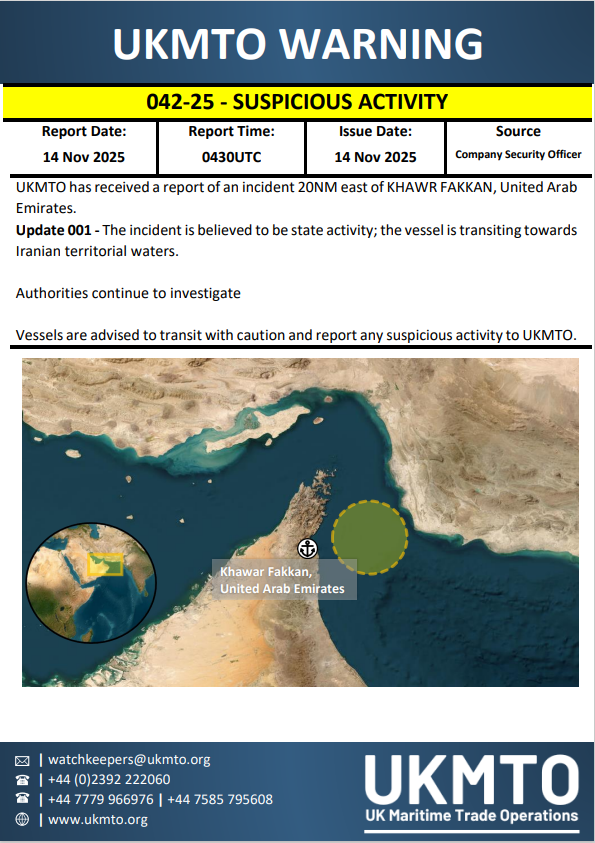 The UK authority said the tanker, reported 22 nautical miles east of the UAE port of Khor Fakkan, had been approached by three small vessels whilst transiting southbound through the Strait of Hormuz before later deviating course in the Gulf of Oman. The agency described the incident as "likely highly targeted".
