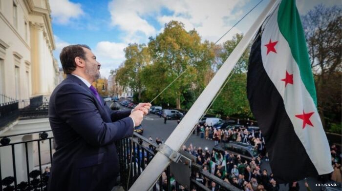 al-Shaibani attended a symbolic flag-raising ceremony at the Syrian Embassy in London, in the presence of a large number of Syrian expatriates. It is the first time the Syrian flag has flown above the building since 2011