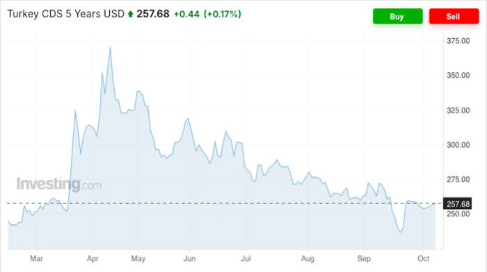 Turkey’s CDS hover above 250-level. Yield on Turkish government’s 10-year eurobonds steady below 7%-level.