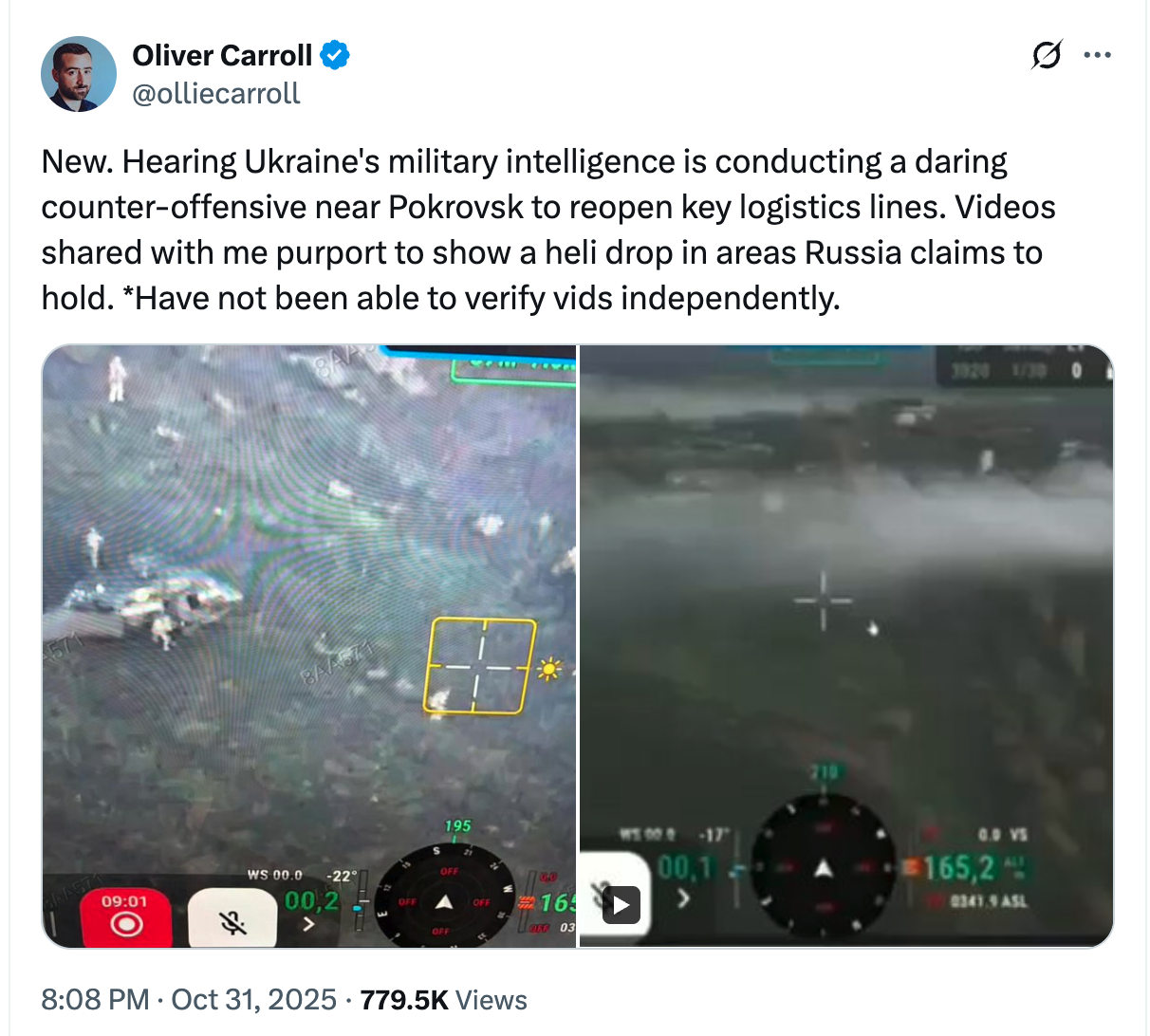 “New. Hearing Ukraine’s military intelligence is conducting a daring counter-offensive near Pokrovsk to reopen key logistics lines. Videos shared with me purport to show a heli drop in areas Russia claims to hold. Have not been able to verify videos independently,” Carroll posted.