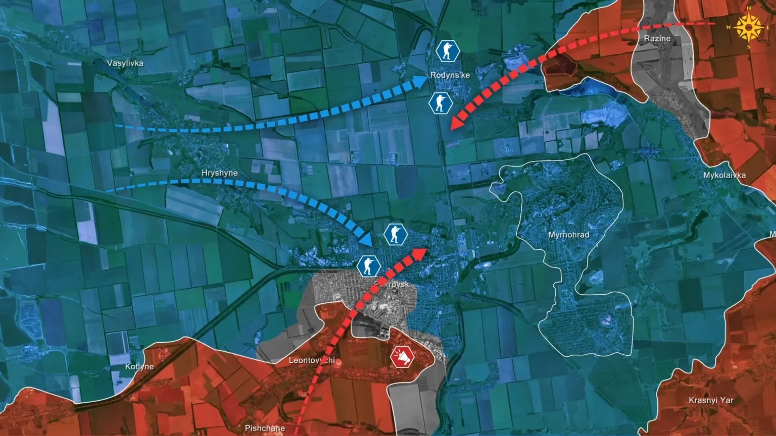 But perhaps most critically, Russian troops began attempting to cross the dam near Hryshyne, a village 3km to the west of Pokrovsk, threatening to outflank and encircle Ukrainian units stationed there.