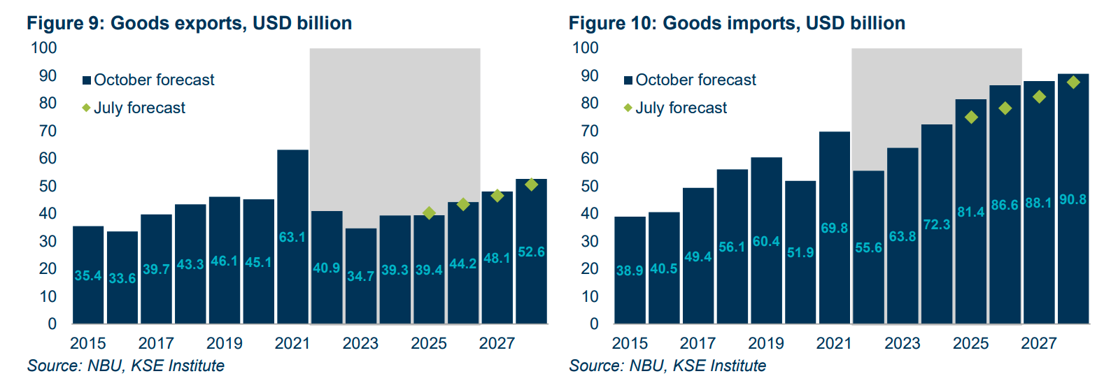 “Ukraine’s trade deficit is growing and turning into a serious structural challenge,” Kyiv School of Economics (KSE) said in its latest Macroeconomic handbook, released on October 28. “The deficit is now projected to reach $42bn in 2025 and is expected to remain seriously elevated over 2026-28. Closing the deficit will be quite challenging as imports are now effectively twice the size of exports, which means that the latter must grow at twice the rate of the former just to maintain the gap in absolute terms.”