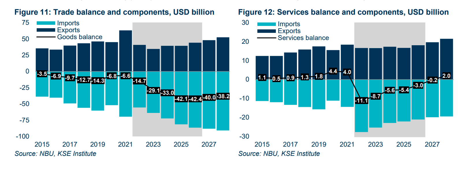 The services balance, meanwhile, offers a more encouraging outlook. The KSE projects a gradual improvement, moving from a deficit of $5.6bn in 2024 to a surplus of $2bn by 2028, reflecting a long-delayed return of Ukrainian refugees, which is not expected to begin in earnest until the war ends. While services imports, particularly related to travel, remain high, exports are set to grow by 24.2% by 2028, boosted by IT and business services.