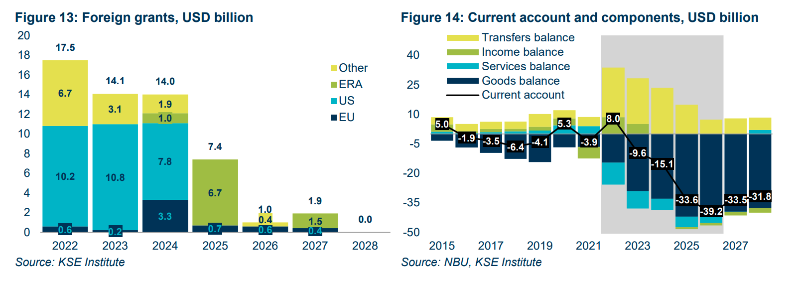 Secondary income inflows, primarily from international donors, reached $17.5bn in 2022 and remained around $14bn in 2023–2024. However, that figure is expected to fall to $7.4bn this year, and further to just $1–2bn in 2026–2027, as assistance shifts from grants to loans under mechanisms such as the EU’s Ukraine Facility and US aid ends.
